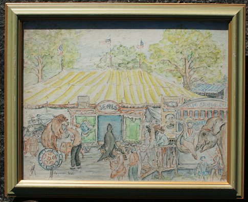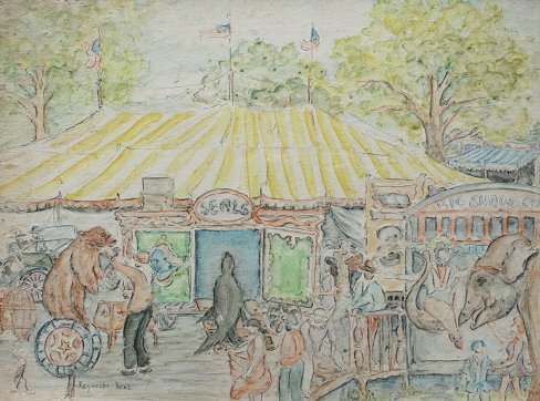 BEAL, Reynolds, (American, 1867-1951): Big Show Circus, Mixed Media/Board, 12 1/2'' x 16'', signed, framed under glass, 15'' x 18 1/2''. Sporadic loss of white ground, in margins mostly, sold as is.