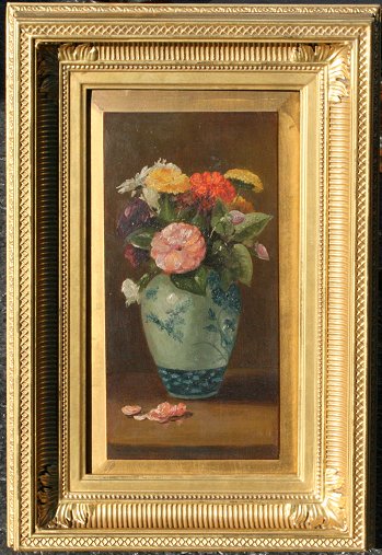 CHAMPNEY, Benjamin, (American, 1817-1907): Still Life of Flowers in a Vase, OIL/Beveled Wood Panel, 16'' x 9'', unsigned, gilded reproduction frame, 22'' x 15''. Provenance: Estate of Benjamin Champney, Alice Sparks, (Champney's Grand-daughter, Collection of Robert A. Goldberg, Private Collection.