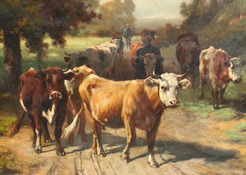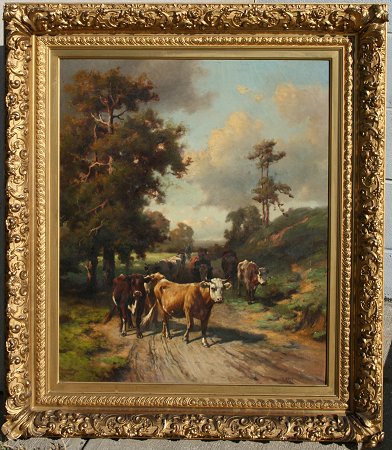 FOX, Robert Atkinson, (American, 1860-1927): Cows on Path, OIL/C, 30'' x 25'', signed lower right, encased in elaborate period gilt frame, 39'' x 34''.