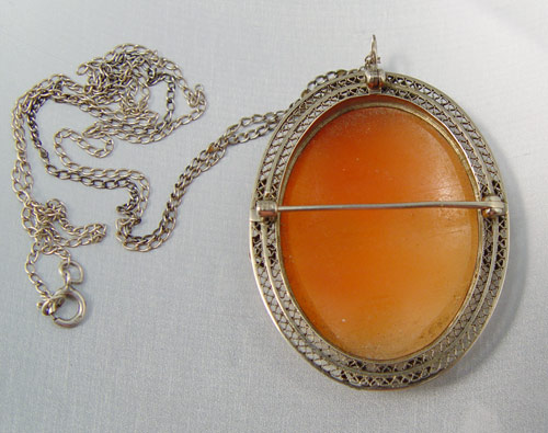 14K SHELL CAMEO BROOCH: 14K white gold framed shell cameo brooch. Female Grecian profile. Filigree frame with bar pin and bail. Approx. 1 5/8 x 1 3/8'' Sterling silver chain attached. Weight: 9.3 grams. This is the first of many cameos coming up in this auction.