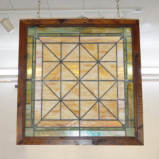 GEOMETRIC DESIGN STAINED GLASS WINDOW: Wood framed, 37 1/2'' x 36 1/4'' overall.