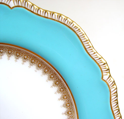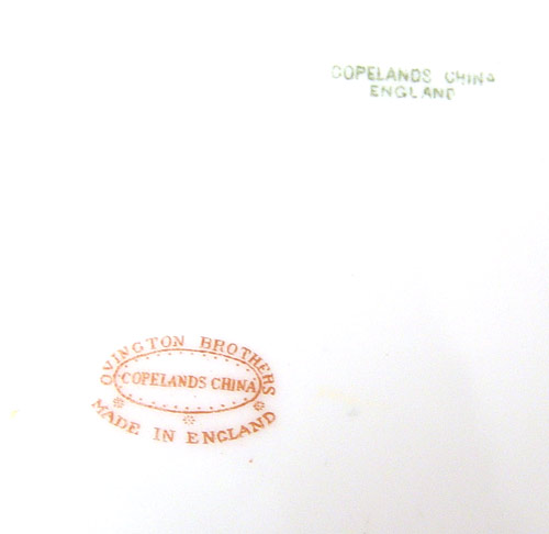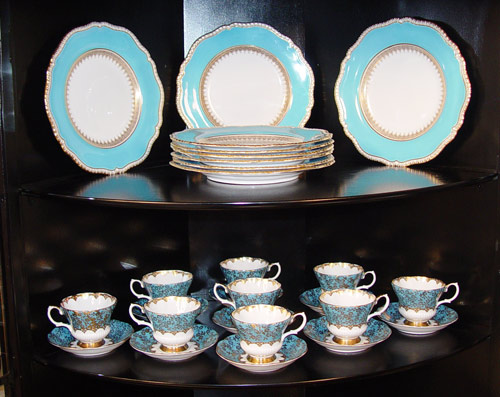 9 COPELAND SERVICE PLATES AND 9 ROYAL ALBERT CUPS AND SAUCERS: Copeland fine china for Ovington Bros. Matched set of 9 gilt decorated plates, 10'' dia. Sold together with a set of 9 coordinating gold and blue cups and saucers by Royal Albert in the Consort Series pattern.