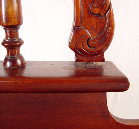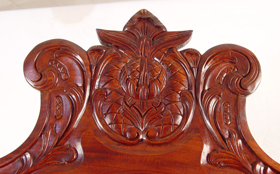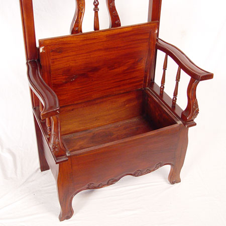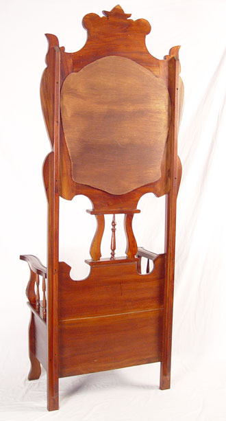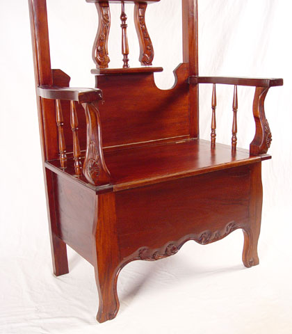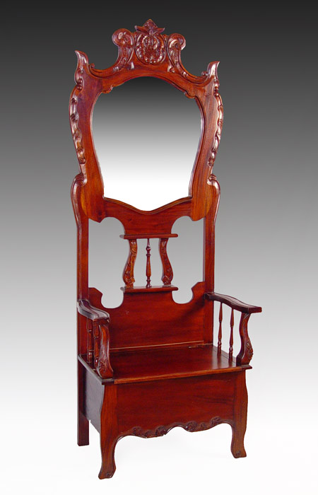 CARVED MAHOGANY HALL TREE / BENCH: Shaped and beveled mirror over lift top storage bench, turned arm supports, shaped skirt. Measures 86'' high x 33'' x 19 1/4''