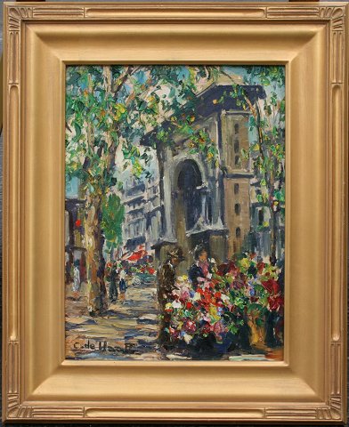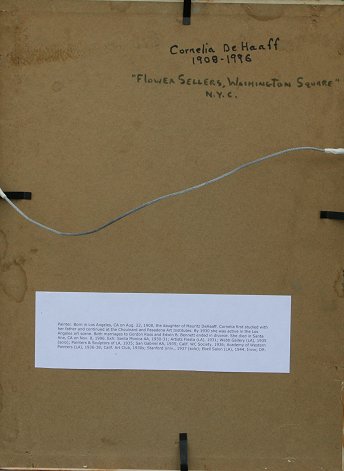 DE HAFF, Cornelia, (American, 1908-1996): ''Flower Seller, Washington Square NY'', OIL/B, 16'' x 12'', signed lower left, reproduction carved and gilded American impressionist frame, 22'' x 18''.