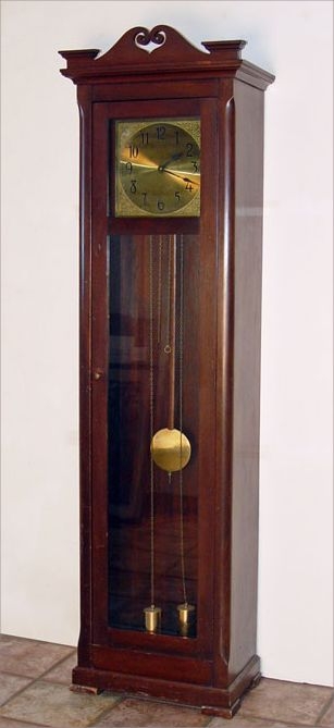 JUNGHANS GERMAN BRASS FACE LONGCASE CLOCK: Brass face with cherub design corners. Weight driven with 2 weights and pendulum mechanism. Marked Junghans on works. Note several nicks and gouges to case. Measures 77'' high x 22 1/2'' wide x 14'' deep.