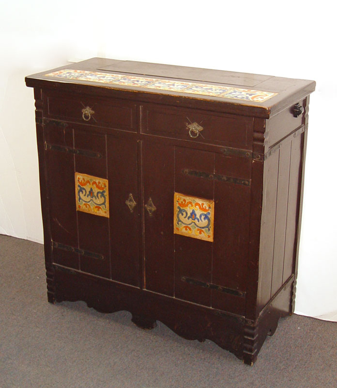 SPANISH OAK BAR WITH TILE INSETS: The back with all the original works for a functioning bar. The front and sides with faux drawers and doors. The bar is said to have come from the estate of the colorful Wm. Parsons, Sea captain of the British Navy, played the violin for Queen Victoria, fought in the Crimean War and fathered a child at 81. Measures 41 3/4'' high x 42 1/2'' x 20'' deep.
