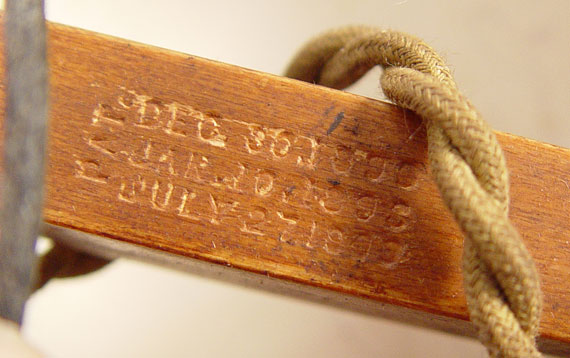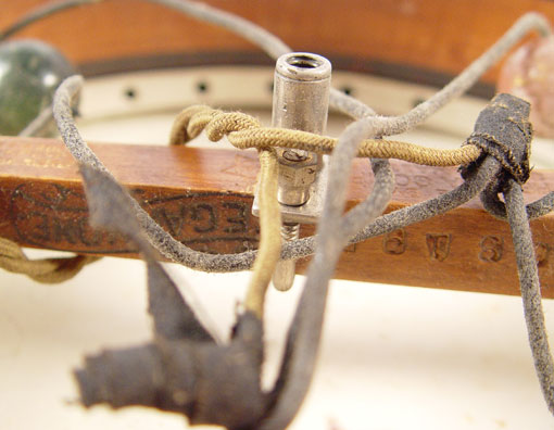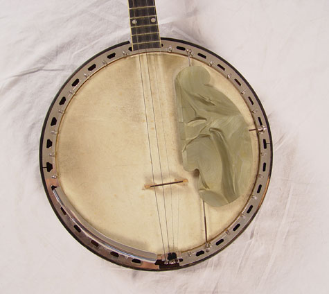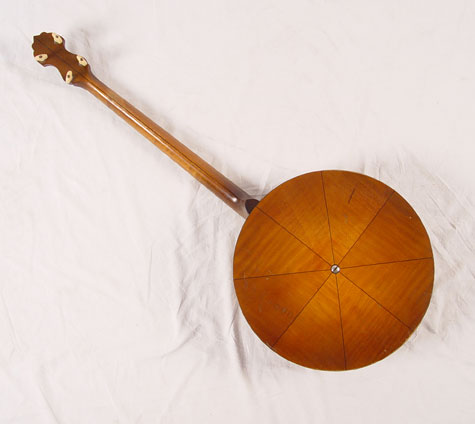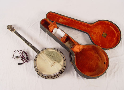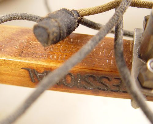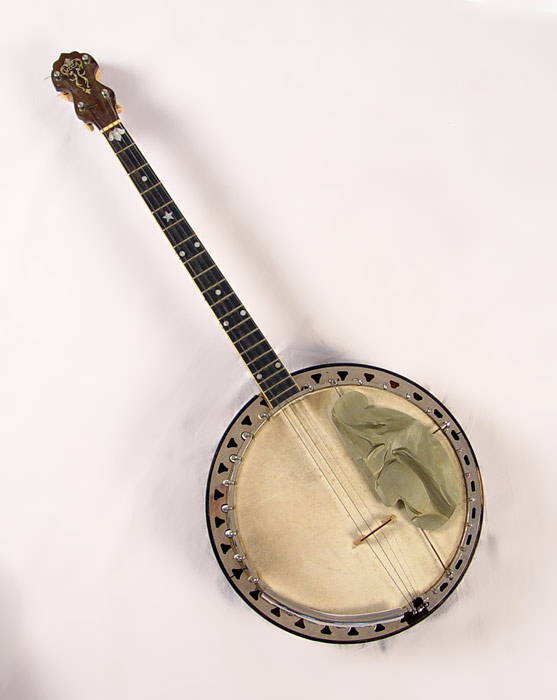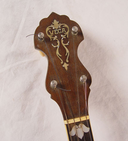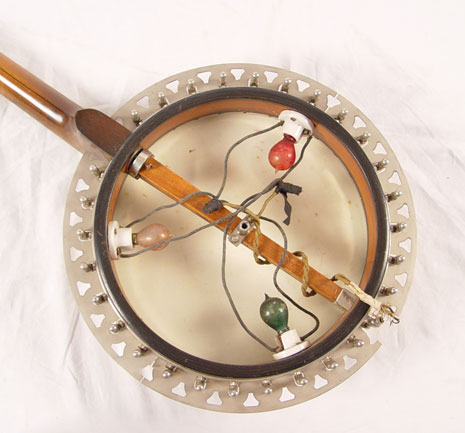 1926 CUSTOM VEGA VEGAPHONE PROFESSIONAL TENOR BANJO: Unique customization with the addition of vintage electric lights on the interior. Vegaphone Professional model serial number 68196 which dates to 1926. 19 fret board with ivory appearance border. Mother of pearl inlay on fretboard and pegboard (note missing inlay on pegboard). Appears to be original skin. Note wear on pie shaped resonator. Comes with original case with Brown University decal of motto and crest. Banjo was used in the Brown University band.