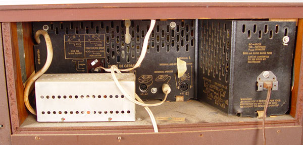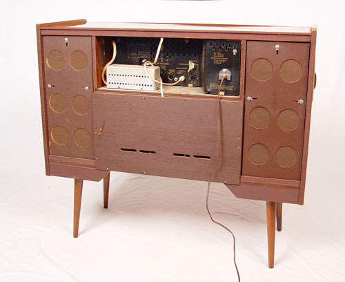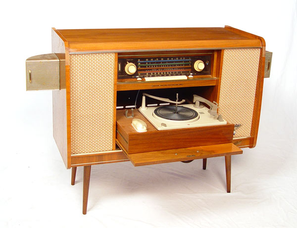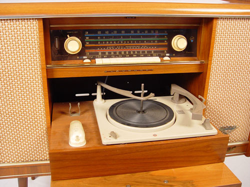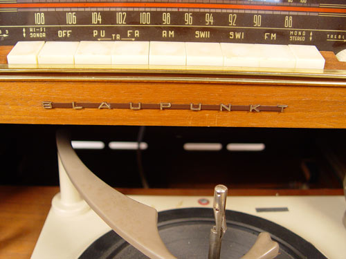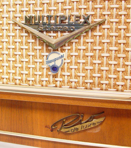 BLAUPUNKT MULTIPLEX DELUXE VINTAGE STEREO CABINET: Mid century design model 3914 with AM/FM shortwave and turntable. Side speakers rotate to forward on sides of case. Serial number US21116. Measures 32 3/4'' high x 37 1/4'' x 15 1/2''. Note finish & loss of veneer, turns on radio works, turntable is sticking.