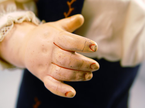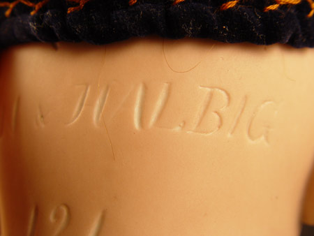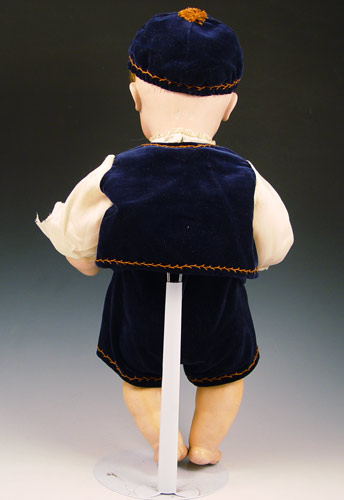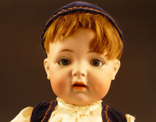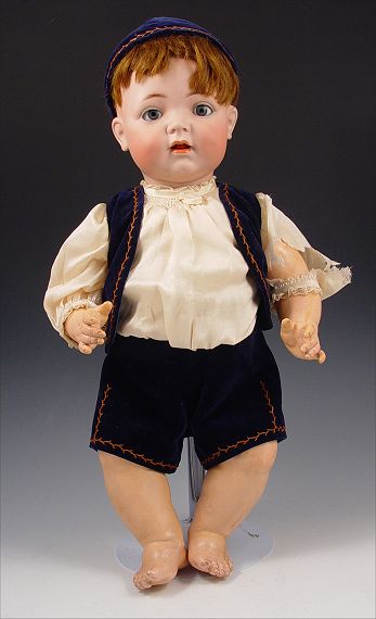 SIMON & HALBIG FOR KAMMER & REINHARDT BOY CHARACTER BISQUE HEAD DOLL: Bisque head incised ''K star R Simon Halbig 121 50''. Sleepy blue eyes, open mouth with two teeth, dimple chin, and rosy cheeks. Composition body with small amount of crazing. 20'' tall.
