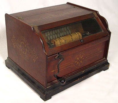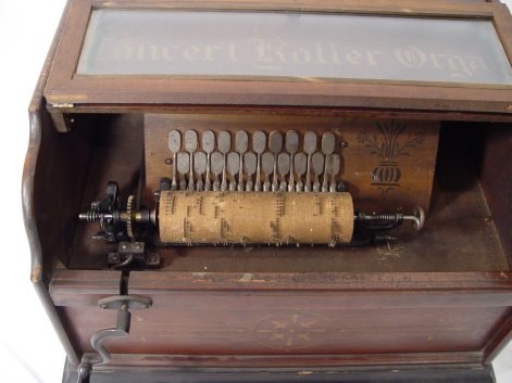 CONCERT ROLLER ORGAN: Complete with 14 cobs or rolls. Gold stencil decorated box. 12 2/3''h. x 18'' x 18''.