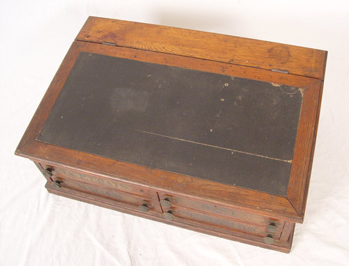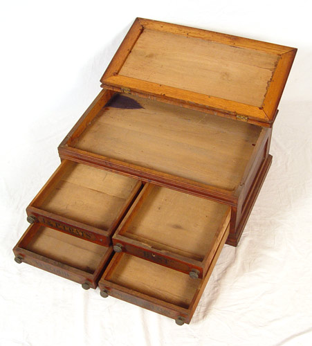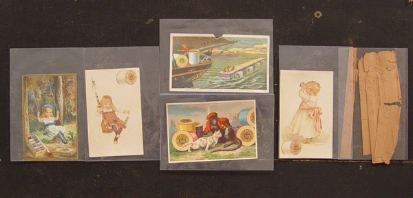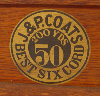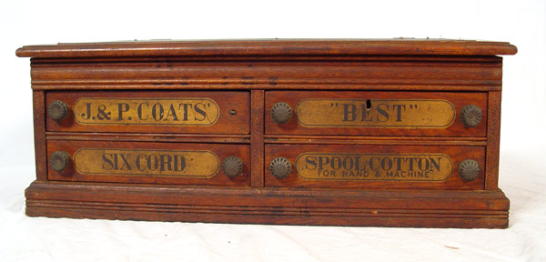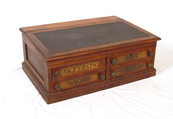 JP COATS 4 DRAWER SPOOL CABINET AND POSTCARDS: Lift top, 4 drawers. The graphics are still clear though it is in used condition, loss of one knob. Measures 11 3/4'' high x 29 3/4'' x 20. Sold with 5 vintage spool related postcards.