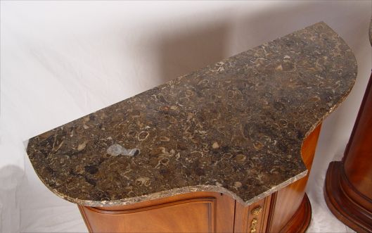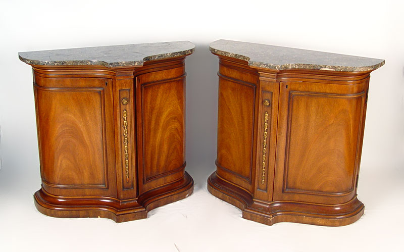 PAIR HERITAGE CO. CONTEMPORARY MARBLE TOP COMMODES: Shaped marble top, the doors follow the graceful curves of the top. Measures 29 1/2'' high 32 1/4'' x 14 1/2''
