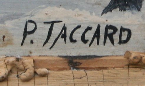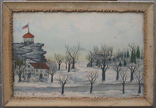 TACCARD, Patrick, (American, 1879-): Naive Snowy Landscape in the Primitive Style , Folk Scene, OIL/Masonite, 17'' x 26'', signed, painted white frame with wear, 20'' x 29 1/2''.