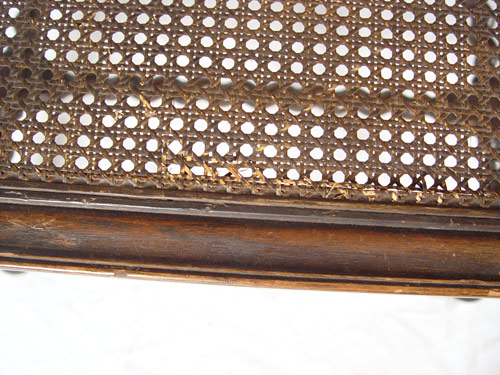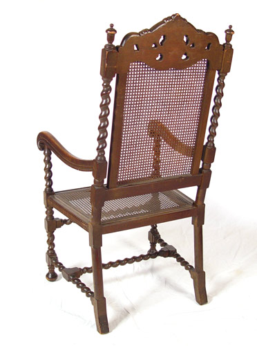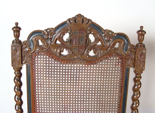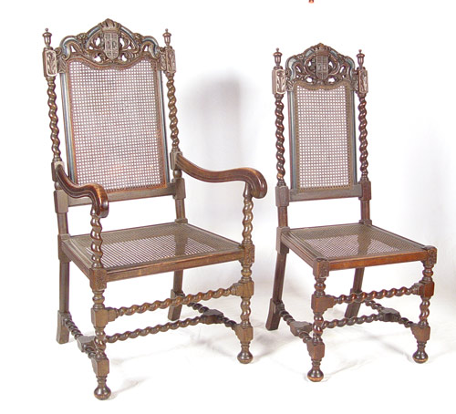 CARVED AND PIERCED BARLEY TWIST WALNUT OPEN ARM CHAIR AND SIDE CHAIR: Matched pair with cane backs and seats, heraldic caned back and seat. Arm chair measures 49'' high x 24'' x 24''. The side chair is more petite at 46'' high x 19'' x 17''.