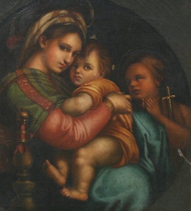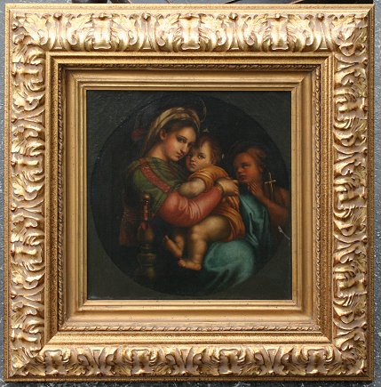 19th C OIL/C PAINTING, COPY OF RAPHAEL'S MADONNA AND CHILD: 13 1/2'' x 13 1/2'', no visible signature, encased in elaborate carved and gilded contemporary frame with acanthus leaf motif, 23 1/2'' x 23 1/2''.
