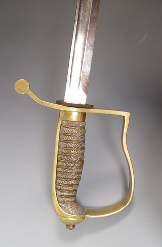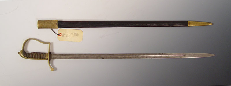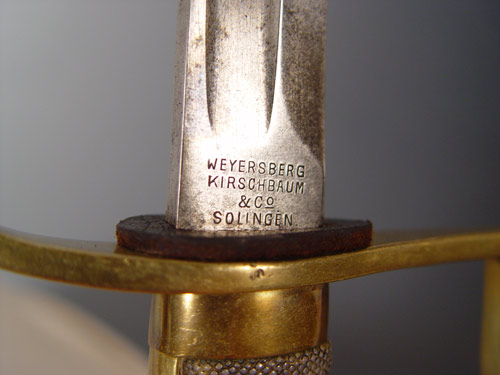 1880'S GERMAN WEYERSBERG KIRSHBAUM SWORD: Circa 1880's - 1900's, marked Weyesberg Kirshbaum & Co Soilingen on ricasso, stylized crown on opposite side. Brass hilt with sharkskin grip, note areas of wear on grip, loose area of twist wire. Still retains original leather washer. Straight blade show age staining, no rust, measures 28 3/8'' long. Leather scabbard with brass mounts intact. Note wear and bend line. Sword was reputedly taken from a Austro-Hungarian gunboat in Italy during WWI by Seaman Warren G. Addison. Overall length 36''.