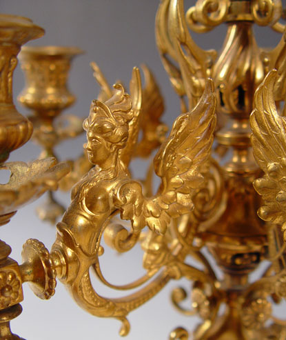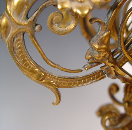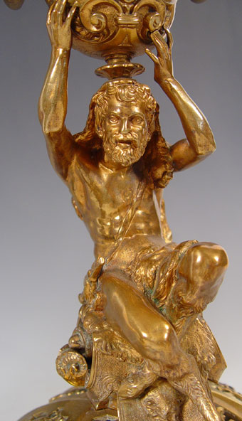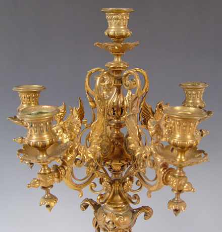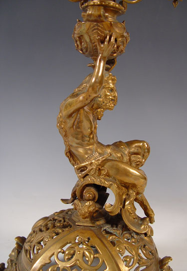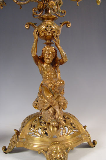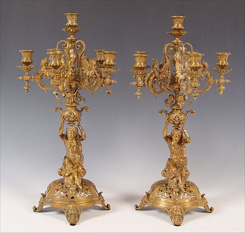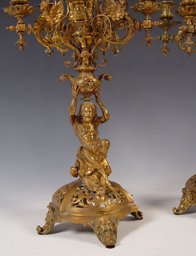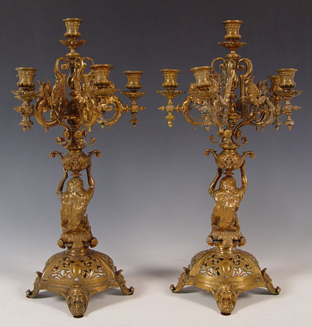 PAIR BRONZE FIGURAL CANDELABRUM: Measures 21 3/4'' high x 11'' overall dia. Note one arm in need of minor repair.