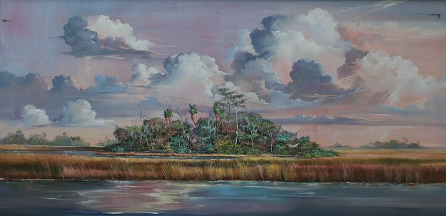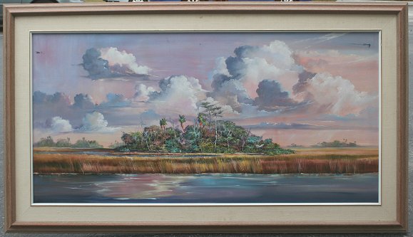 HANCOCK, Fran, (American, 20th C): Florida Everglades Landscape, OIL/Canvas, 24'' x 48'', signed, encased in white washed wood frame, 31 1/2'' x 56''.