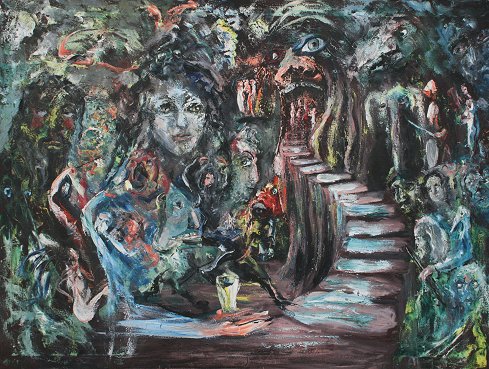 VANDERCAR, M. Louis, (American, 20th C.): Surreal Halloween Scene, ''Aul Hollow E'Ne'', OIL/C, 36'' x 48'', signed and titled verso, unframed.