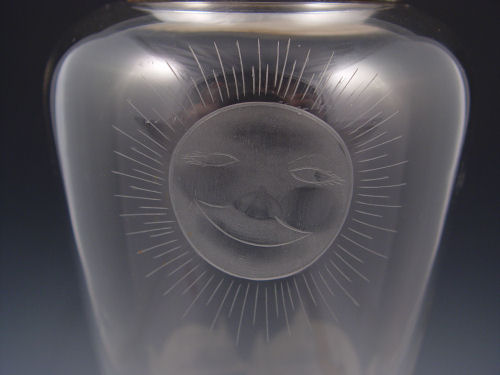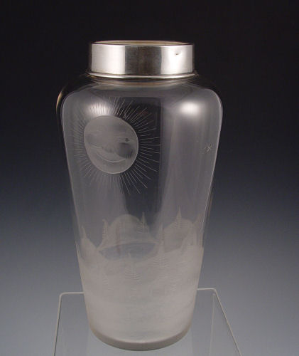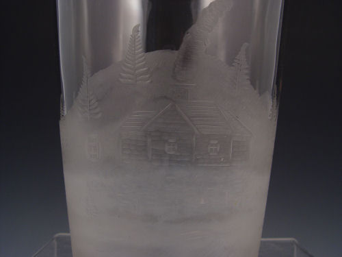 STERLING MOUNTED HAWKES CRYSTAL VASE: Etched log cabin in scenic landscape with a whimsical smiling sun. The rim with impressed ''Hawkes Sterling'', 9 5/8''h.