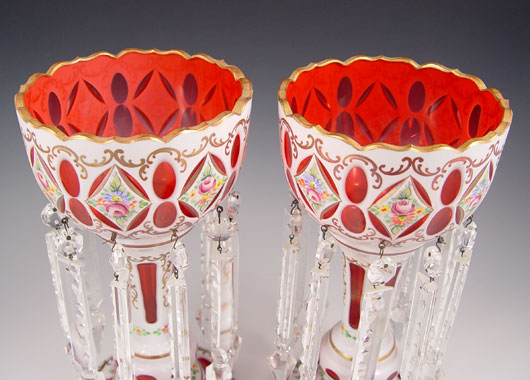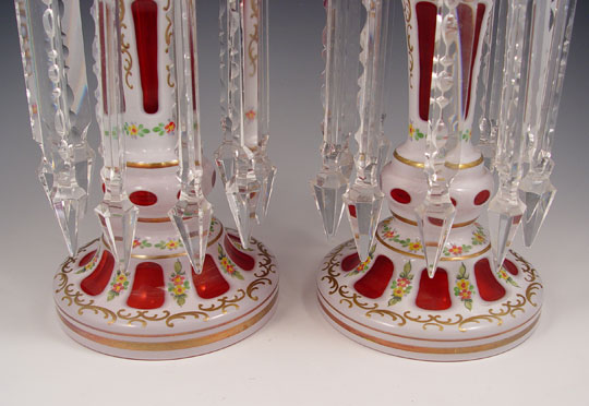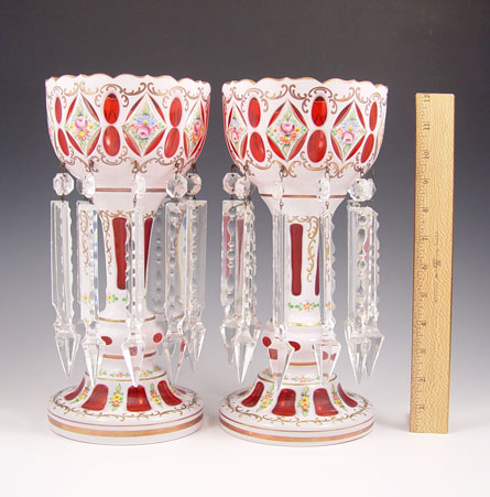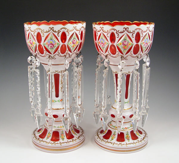 PAIR BOHEMIAN CUT TO CRANBERRY LUSTERS: White cut to cranberry with enameled floral decoration, cut crystal prisms. 12 1/4'' tall, 6'' dia.