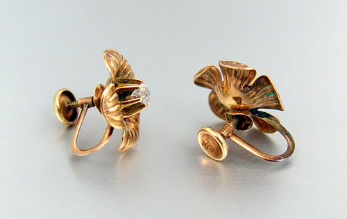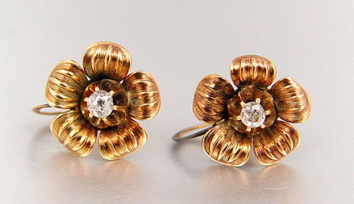 FLOWER FORM MINE CUT DIAMOND EARRINGS: 10K yellow gold earrings contain 2 old mine cut diamonds. Weight: .25 Ct. Approx. Rated SI in clarity and I-J in color. The diamonds are prong set. French screw-back closures. Weight: 2.4 grams.