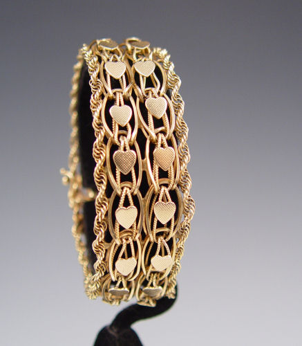 14K FANCY WIDE GOLD HEART BRACELET: Fancy link with heart shaped appliques. Rope chain outer edges. Length: 7'' Width: 7/8'' Figure eight safety clasp. Weight: 32.8 grams.