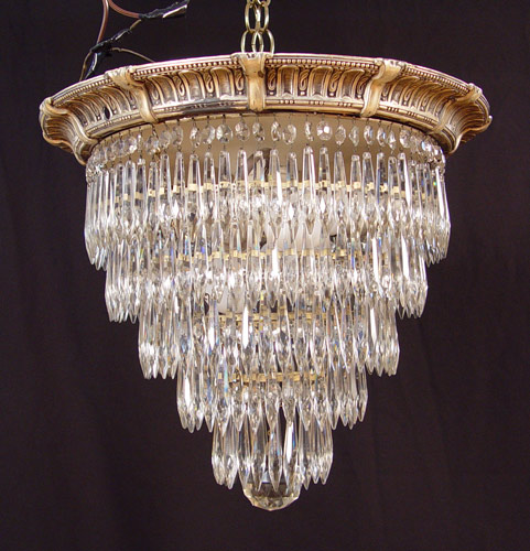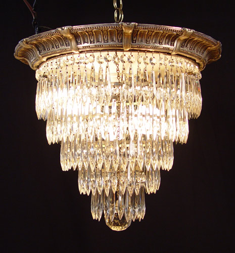 TIERED CRYSTAL CHANDELIER: Marked OW. Mfg. Co. NY. on top. Measures 16'' high x 17 3/4'' dia.