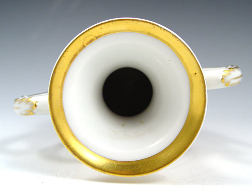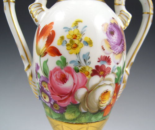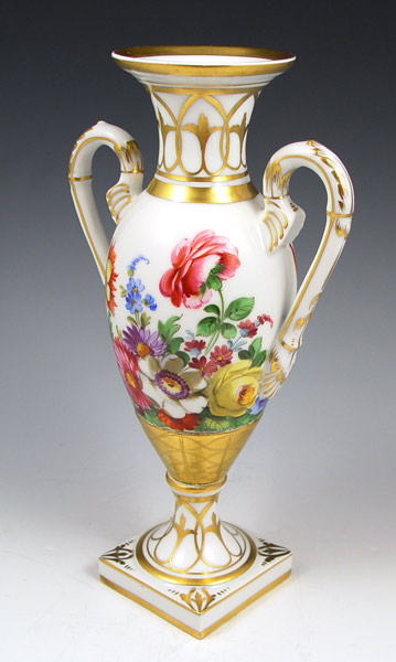 CARL THIEME DRESDEN HAND PAINTED PORCELAIN VASE: Equally well decorated front and back. Urn form with gilt throughout. 10 3/8'' tall.