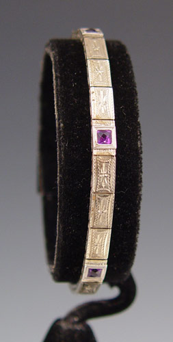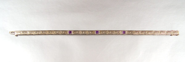 14K EDWARDIAN BRACELET: 14K white gold bracelet contains 3 square 3.00 mm purple stones of unknown origin. Rectangle links with engraved design. Hidden hinged safety clasp. 7'' long. Weight: 9.4 grams.