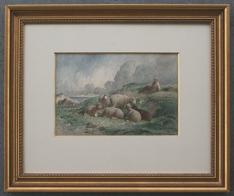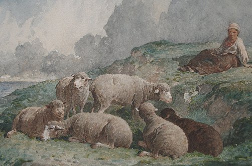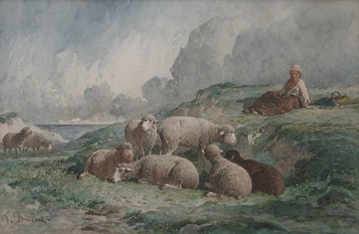 BRISSOT DE WARVILLE, Felix Saturnin, (French, 1818-1892): Shepherdess tending her flock of sheep, W/C, sight size 9 1/2'' x 14 1/2'', signed, fine contemporary gilded molding, 21 1/2'' x 26 1/2''.