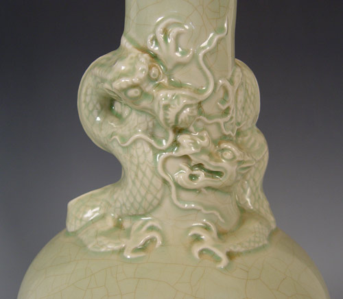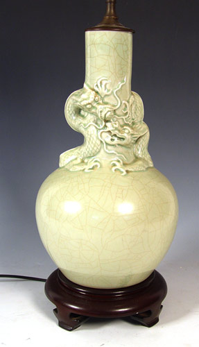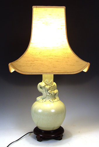 CHINESE CELADON LAMP: Figural dragon motif porcelain base on wood base. Porcelain measures 14'' high x 8'' dia. note crazing. Overall 30 1/2'' high to finial. Shade measures 14 3/4'' high x 16 1/4'' square. Age unknown .