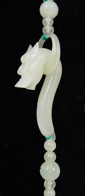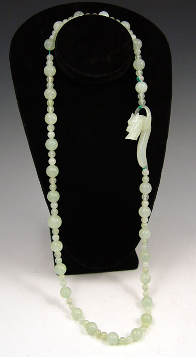 CHINESE JADE CARVED DRAGON AND BEAD NECKLACE: Lovely translucent light green jade, asymmetrical necklace, figural 2 1/4'' dragon head and ring clasp, 12 mm carved beads and 7 mm polished beads, 33''l.