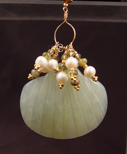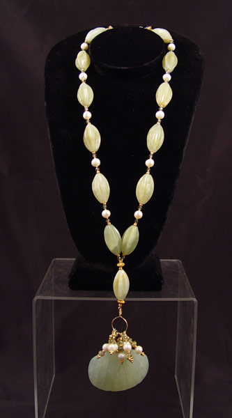 ALICE MENDEZ CAMPOS NECKLACE: Hand crafted by designer Alice Mendez Campos, carved jade?, peridite beads and pearls on gold vermiel wire with gold beads intermixed. Strung on braided stainless steel bead cord. One and only engraved original piece from Manhattan jewelry designer.