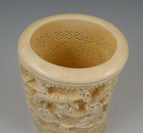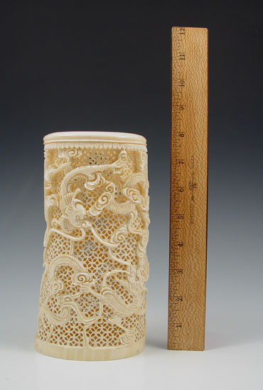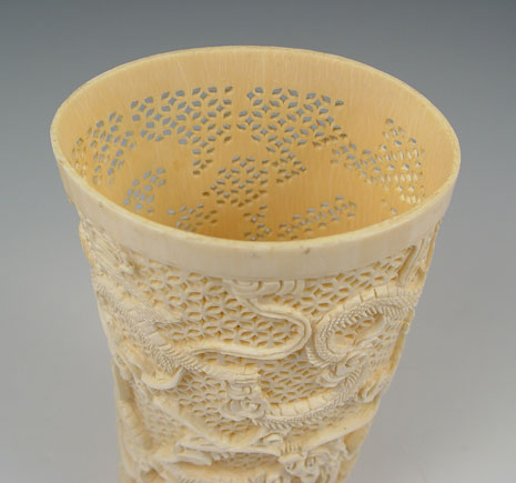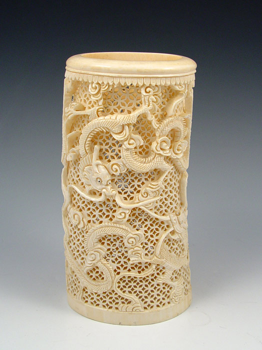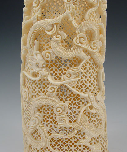 PIERCED CARVED IVORY TUSK: Carved dragon motif with pierced background from single piece. Measures 7 7/8'' high x 4 1/8'' oval.