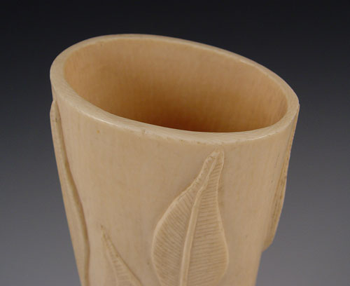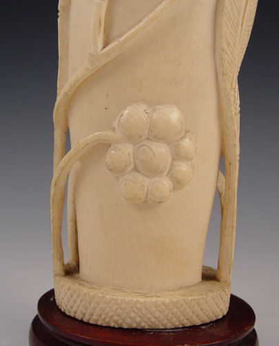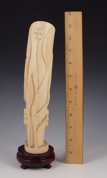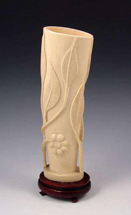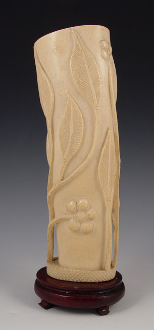 CARVED IVORY TUSK: Carved floral design with openwork branches. Mounted on wood stand. Tusk measures 9 3/4'' high x 3 1/8'' oval, overall 11'' high on stand.