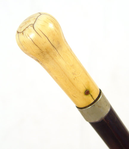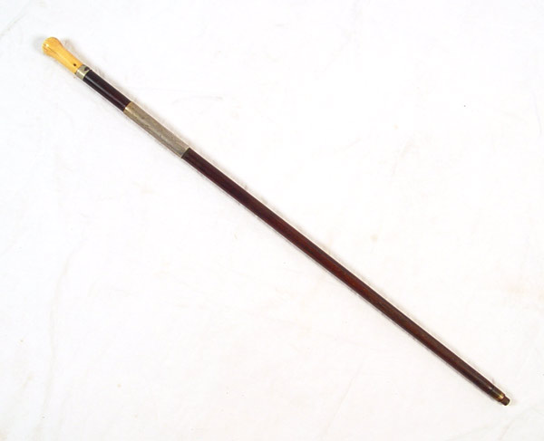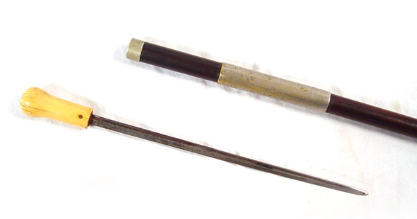 IVORY HANDLE SHORT SWORD CANE: Circa mid 19th century elephant ivory handle with short sword attached. Trace of original fire blue decoration remains on 11 1/4'' blade. Peppering to metal on blade. Solid wood shaft with silvered brass mounts, brass tip. Measures 34 3/4'' overall.