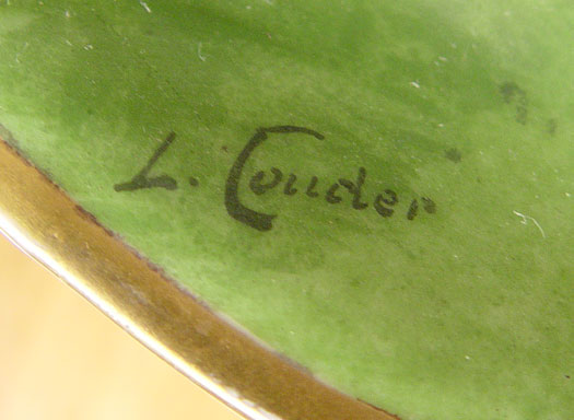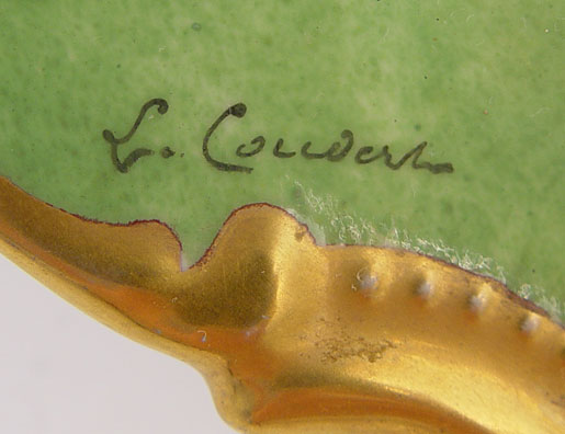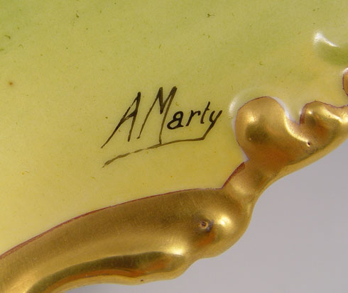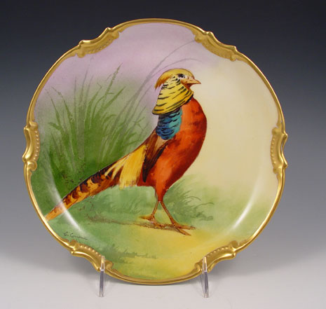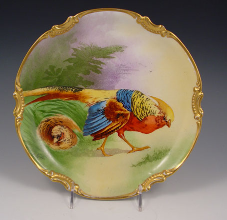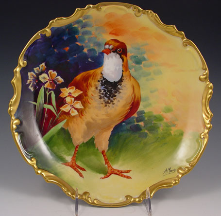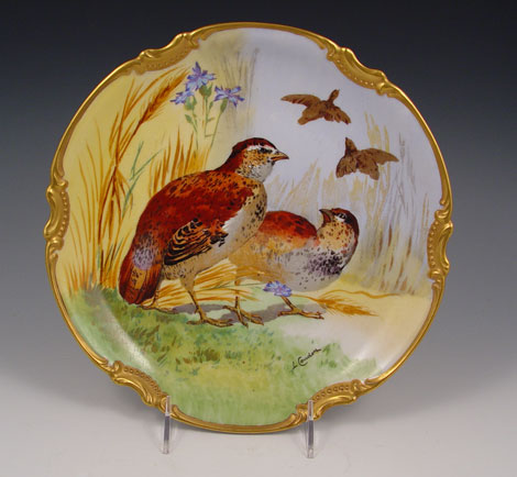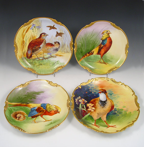 SET OF 4 FRENCH LIMOGES ARTIST SIGNED GAME BIRD PLAQUES: George Borgfeldt Coronet richly decorated wall mount chargers. Each artist signed- A. Marly and L. Caudern (?). 10'' - 11 1/4'' dia.