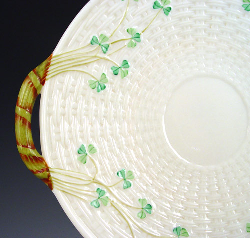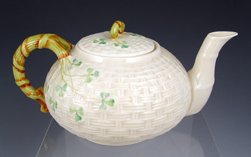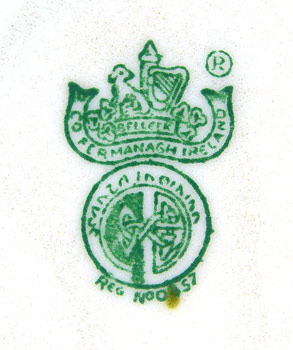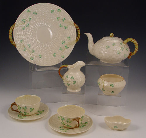 IRISH BELLEEK SHAMROCK CHINA: Teapot, cream pitcher, open sugar, cake plate and salt- all with the green mark. The two cups and saucers have the black mark.