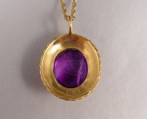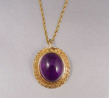 5 CT AMETHYST PENDANT: 18K yellow gold pendant contains one oval shaped cabochon cut amethyst. Weight: 5.00 Ct. Approx. 14K yellow gold 14'' fine rope chain. Weight: 2.8 grams 18K and .90 grams 14K.