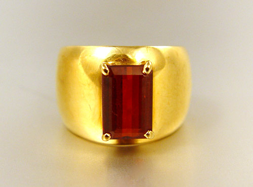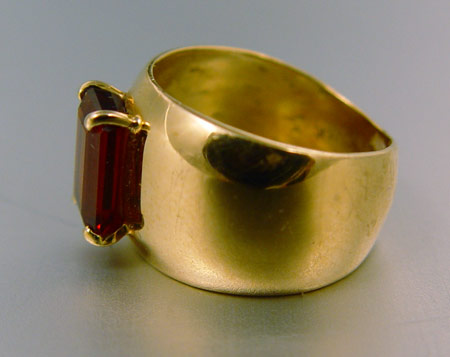 14K 3.50 CT. GARNET RING: 14K yellow gold ring contains one emerald cut garnet, approx. weight 3.50 Ct. The garnet is prong set in a wide tapered band. Size: 5 Weight: 5.6 grams.