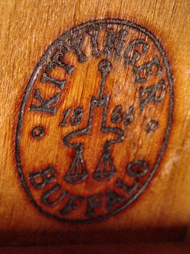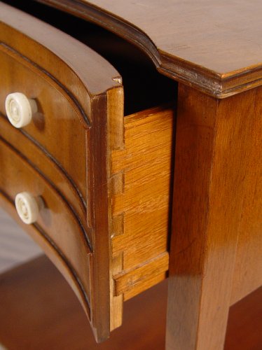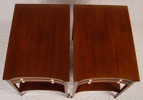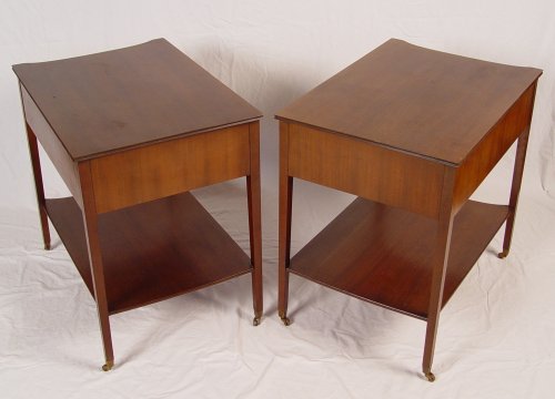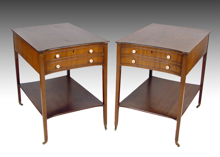 PAIR KITTINGER SIDE TABLES: On casters, 2 drawers with lower shelf. Ivory appearance pulls. Note chip on top of one. Measures 26'' high x 27'' x 19''