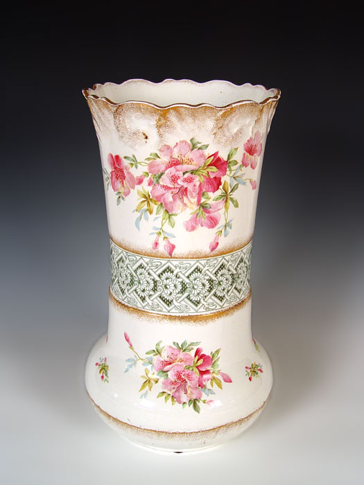 TURN OF THE CENTURY FLORAL DECORATED UMBRELLA STAND: Unmarked, measures 21 1/2'' high x 12'' overall dia.