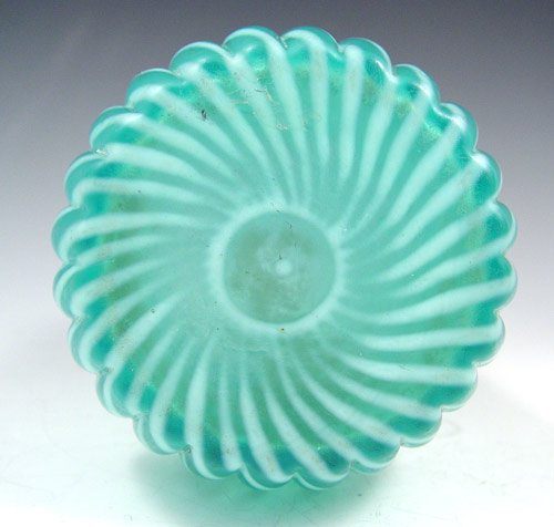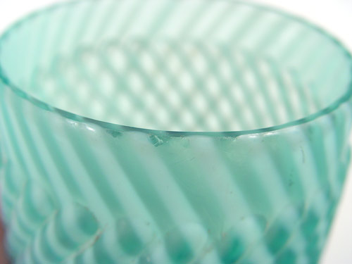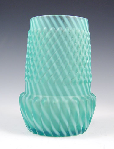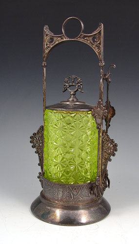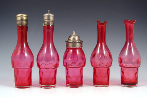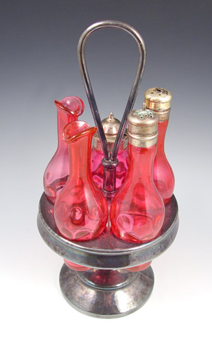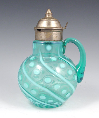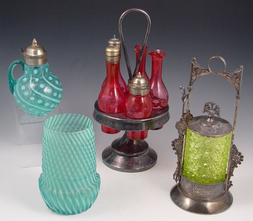 GOOD GROUP OF VICTORIAN ART GLASS: To include 1) Blue Chrysanthemum Swirl celery vase, 6 1/2'' tall. 2) Blue opalescent Coin Spot syrup pitcher, 6 1/2''h. 3) Vaseline Daisy & Button pickle castor in Homan silverplated holder with tongs 4) A five bottle Castor set with thumbprint cranberry glass bottles, lacking the stopper on 2. Sold as a lot.