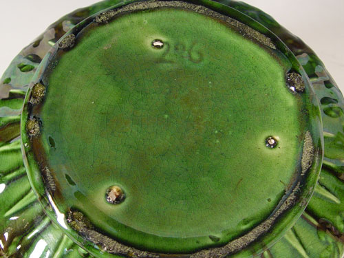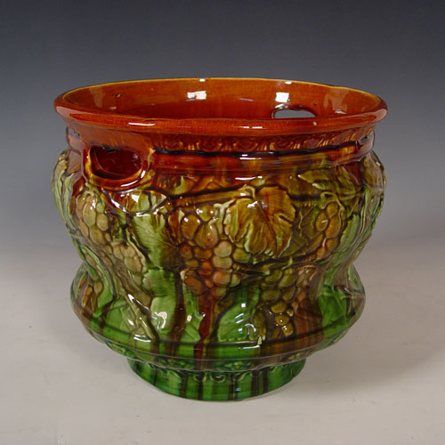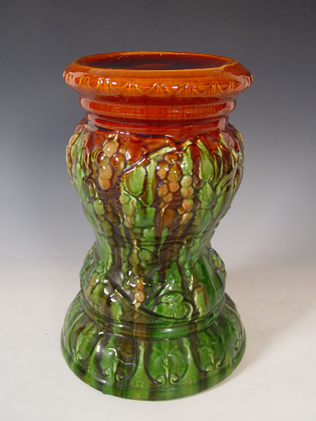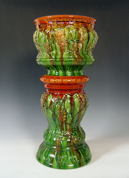 BRUSH MCCOY GRAPE DESIGN JARDINIERE & PEDESTAL: Jardiniere measures 10 3/4'' high x 12 1/2'' overall dia. Pedestal measures 17'' high x 11 1/2'' base dia.
