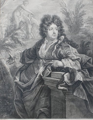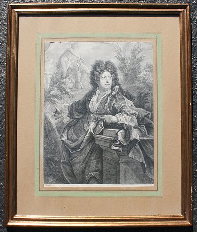 STEEL ENGRAVING AFTER NICOLAS DE LARGILLIERE: Portrait of an Important Woman, in a Courtyard Setting, sight size 16'' x 12 1/4'', gilded frame with minor wear, 25'' x 21''.