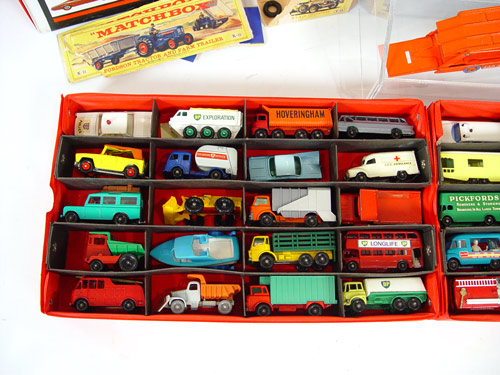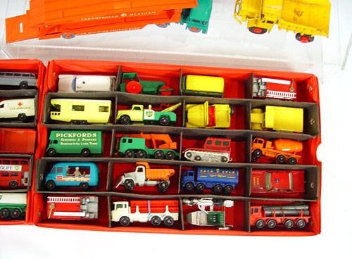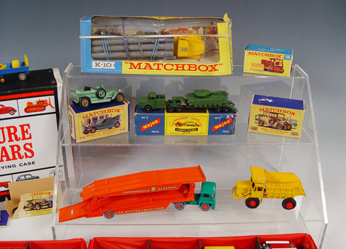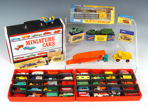 45 PIECE VINTAGE LESNEY MATCHBOX CARS COLLECTION: Approx 40 cars in vintage 1966 Mattel carrying case. Also includes Major Pack #3 Mighty Antar low loader with Centurion tank (note missing tracks) in original box, Farnborough Car auction transporter, Foden Dump truck, Y-15 Rolls Royce Silver Ghost in original box, K-10 King Size Pipe Truck. All cars show minor signs of use and play, some wheels loose, note box conditions. Case measures 3 1/2'' x 13'' x 8 1/4''.