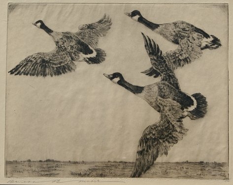 MOORE, Benson Bond, (American, 20th C): Geese in Flight, Etching, 7 1/2'' x 9 1/2'', pencil signed, from an edition of 50, contemporary frame, 17'' x 19''. Condition - Small crease in upper left corner, not examined out of the frame.