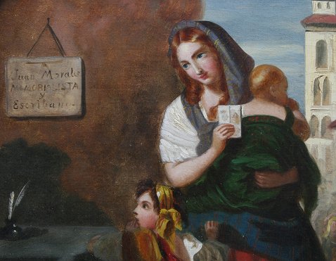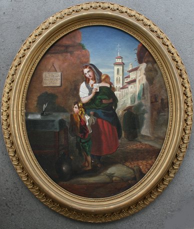 SPANISH GENRE PAINTING OF MOTHER & CHILD: Oil/Canvas, depicts mother with 2 children at the notary's desk, 24'' x 20'', period oval gilded gesso frame with wear, 30'' x 36''.
