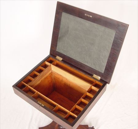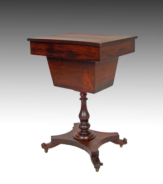MID 1800'S ROSEWOOD SEWING STAND: Hinged top over a compartmented interior, scroll feet. Measures 29'' high x 19 3/4'' x 15 3/4''